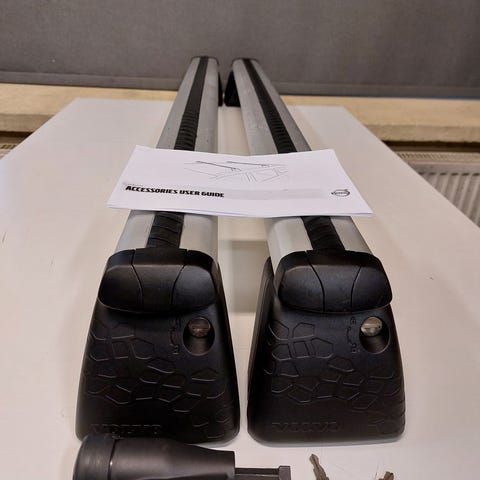 Otsikonmukaiset hyväkuntoiset volvon alkuperäiset kattotelineet avaimilla ja omalla kiristystyökalulla. Lähetys onnistuu paketti noin 120cm pitkä joten ei mene toridiilillä.