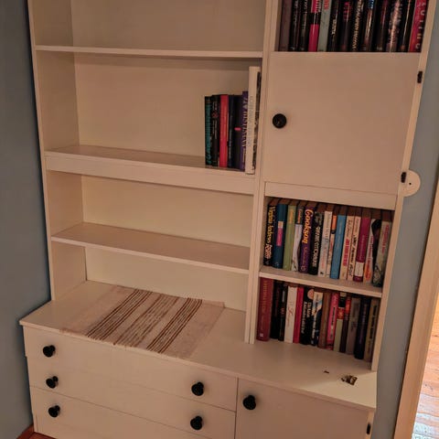 Myydään pyökin värinen kirjahylly.Tässä on kolme osaa,vasemmalla kahdella ovella lasikaapit ja oikealla yhdellä ovella.Keskellä TV taso ja ylhäällä hylly ja alhaalla lasikaapit ja laatikot.Alaosassa kuluma mutta ei haittaa käyttöä.Kuvaa tulossa.Muuton alta pois.