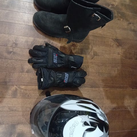 Kuvan kypärä ja hanskat , uuden veroiset. XXL vastaa kokoa XL.