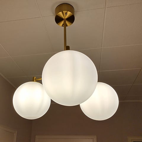 Trio Marley-valaisin. Kuupat lasia, runko valkoista metallia. Leveys 75cm, syvyys 9cm, ripustuskorkeus 150cm. Kiinnitysreikien väli 78mm. Ostettu K-raudasta.