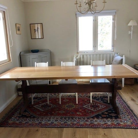 Puusepän valmistama suuri (8 hengen) massiivipuinen ruokapöytä. Pöytä on öljytty harmaan väriseksi. Lankut eivät ole täysin suorat eli raot vaihtelevat ja lankkujen sisäosia ei ole pyöristetty.