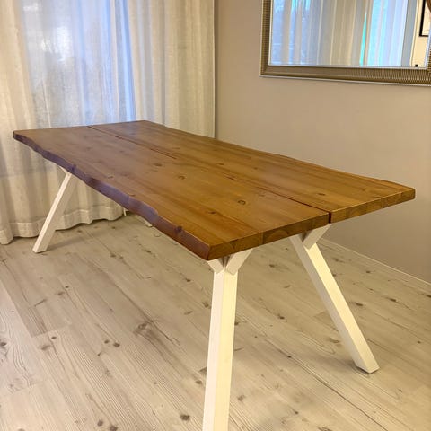 Pöytä on noin viisi vuotta vanha. Olemme käyttäneet vahakangasta pöydän päällä ja lankut ovat melko hyvässä kunnossa, mutta toisen puolen jalat ovat ottaneet osumaa lasten touhuista (ks. viimeinen kuva). Ovat kuitenkin tarvittaessa helposti maalattavissa kalustemaalilla.