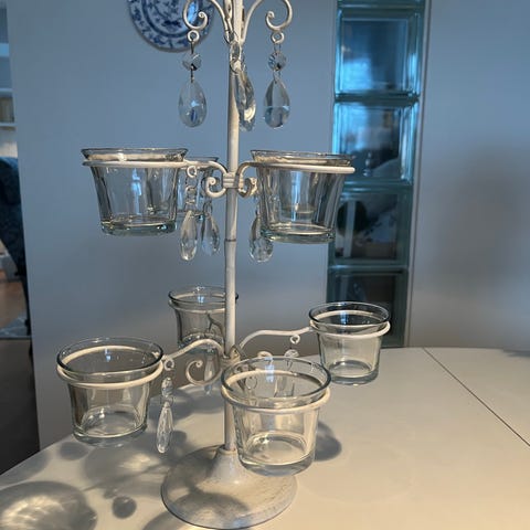 Lyhdyssä on irrotettava lasinen kupu ja metalliset lehdet rungossa. Korkeus n. 14.5 cm ja halkaisija n. 11 cm.
