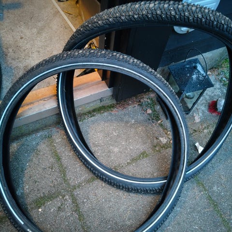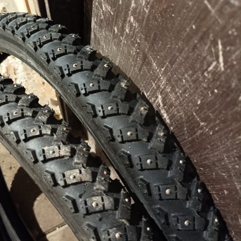 Hyväkuntoiset renkaat joissa nastat tallella. Nämä oli väärän kokoiset omaan pyörään.
