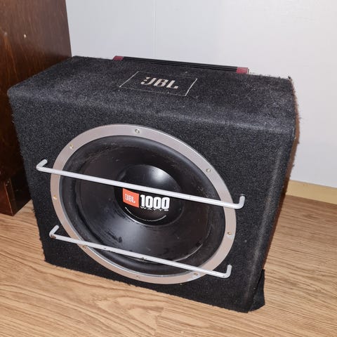 JBL 1000 subwoofer, musta väri. Kaiutin kotikäyttöön tai autoon. Suojaava metalliritilä kaiuttimen edessä. Kaiutin kotelossa, joka on verhoiltu mustalla kankaalla.
