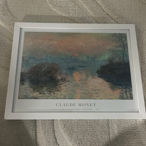 Monet painting in his garden at Argentuille kehystetty taulu. Jämerä kehys, joka jo itsessään muutaman kympin arvoinen. Pari pientä kolhua jotka eivät näy, kun taulu on paikallaan seinällä.