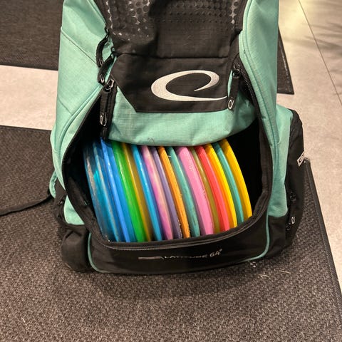 Yhteensä 24 kiekkoa: 8kpl puttereita, 4kpl mid-range, 4kpl fairway driver, 8kpl driver. Lisäksi kuvanmukainen Dynamic Discsin reppubägi, sekä 3kpl merkkikiekkoja. Kaikki kuvan kiekot mahtuvat kivasti bägiin, kun ylätaskua hyödyntää puttereille. Enimmäkseen premium-muoveja.