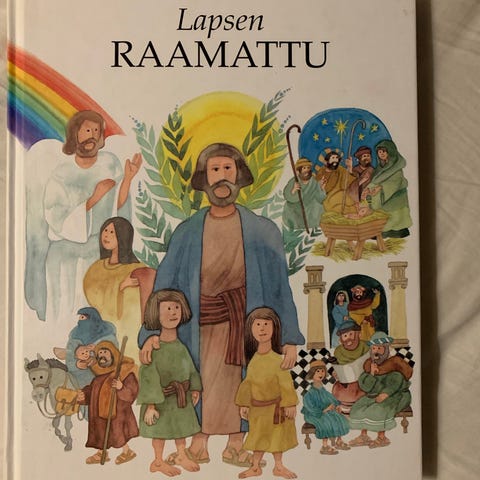 Myytävänä hyväkuntoinen kirja ”Koko perheen Raamattu”. Kirja sisältää 67 Raamatun keskeisintä kertomusta.
