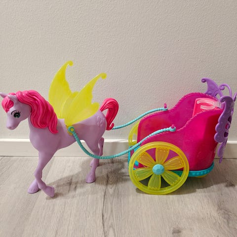 Barbie vaunu ja hevonen lasten lelu. Vaunu on violetti ja vaaleanpunainen, hevonen on valkoinen jossa vaaleanpunaiset harjat. Soveltuu lasten leikkeihin.