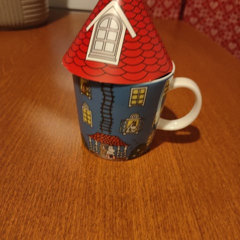Arabia uusi Muumitalo Muumi muki tarralla ja pahvitornilla. (Mukeja löytyy 2kpl, hinta on yhdelle, mutta voit halutessasi ostaa molemmat).