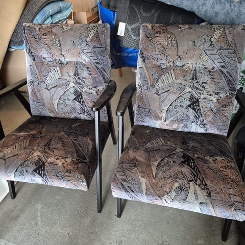 1950 -luvun nojatuolit. Toisen tuolin käsinojassa halkeama. Tekevälle varmasti korjattavissa . Muuten siistit. 250