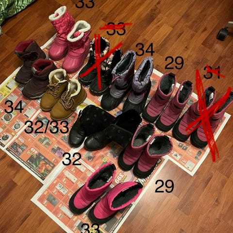 Kuomat 30, viking 32, Crocs c 10, Reebok 35,5, Puma 37, iguana 35