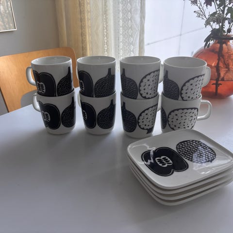 Myydään kuin uudet Marimekon Oiva Kompotti astiat, mukit 2 kpl ja lautaset 2 kpl. Lautasten koko noin 15,5 x 12,5 cm. Kunto erinomainen. Nouto Helsingistä, keskustan-Taka-Töölön suunnilta, tarvittaessa myös muualta. Hinta yht. 60€.