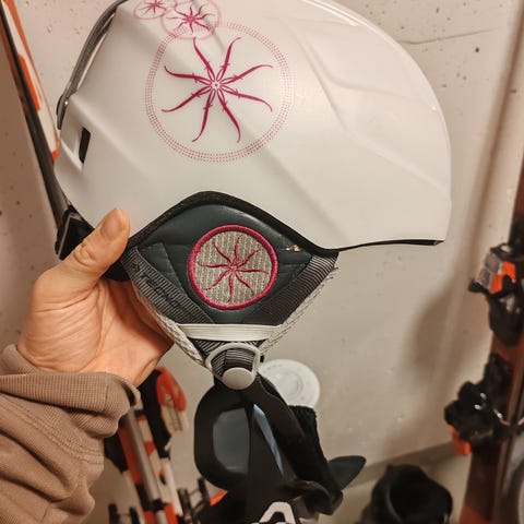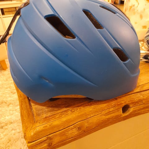Kypärän pinnassa joitakin valkoisia käytönjälkiä. Takana laskettelulasien pidike. Korvaosissa pientä nukkaa pehmusteessa. Mittanauhalla mitattuna, kypärän sisäosan ympärysmitta mitta 56cm.