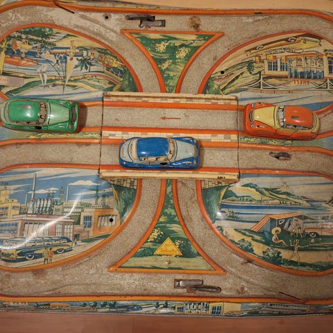 Antiikkinen Masudaya Toys Trade Mark.- 1950 . Made in Japan. peltinen autorata. Toimiva. Todella harvinainen 1950 luvun autorata. Sis alkuperäisen laatikon ja neljä autoa. En löytänyt netistä yhtään samanlaista. Autoradan pituus 61cm. Keräilijä myy kokoelmaansa edullisesti. Nouto