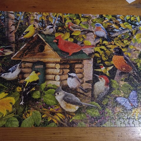 Myydään Trefl -merkkinen 1000 palan palapeli, jossa autotalli aiheinen kuva.