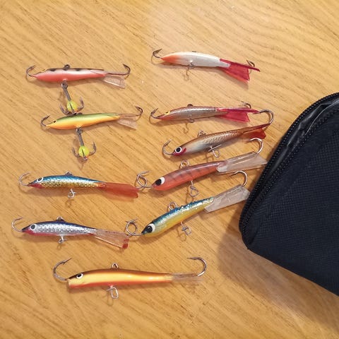 9 kpl 5-8 senttistä pystypilkkiä, joista yksi on Erkki Virolaisen valmistama EV Särmäneula, 6 noin 5-senttistä tasapainoa ja 21 kpl mormyskoita. Kaikki pilkit ovat olleet käytössä, joten osassa on selviä käytön jälkiä.