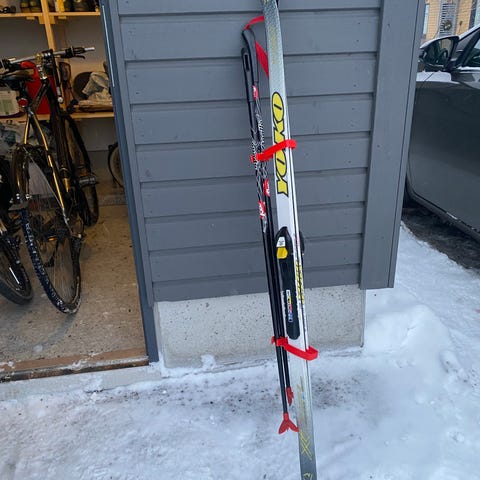 Yoko 140cm sukset. Toisen suksen pohjasta lähtenyt pieni pala. Sns siteillä