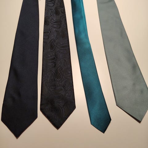 Hyvin vähän käytetyt kravatit, kuin uudet. Kuvan väri hiukan hämää: raidallinen on metsän vihreä (polyester) ja ruudullinen on musta, jossa kuviot kirkkaalla vihreällä (silkkiä). Myydään yhdessä.