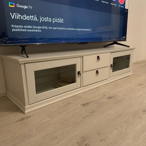 Kaunis vintage-tyylinen TV-taso, valmistettu täyspuisesta akaasiasta. Siinä on joitakin pieniä virheitä, jotka on helppo korjata.