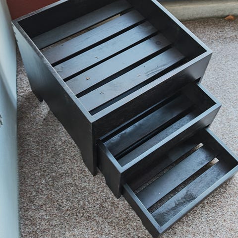 Puinen kukkateline. 4 tasoa. Korkein 94 cm. Yhden tason halkaisija 25 cm. Pinta halkeillut, mutta muuten ehjä. Kunnostamalla saa siistin ja kivan telineen.