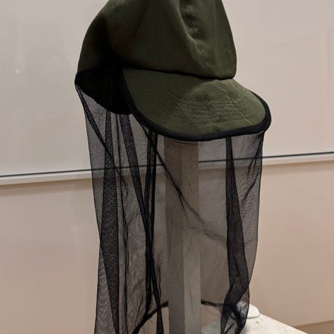 Annetaan hyttyshattu. Väri kulunut epätasaisesti mutta muuten hyvässä kunnossa.