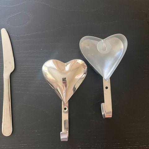 Sisustusliikkeestä ostetut metalliset seinään kiinnitettävät sydän koukut.
