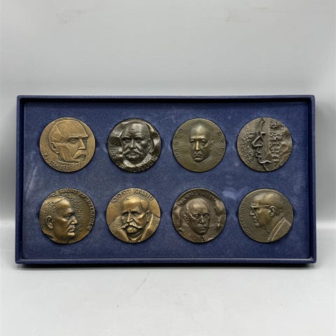 Suomen Tasavallan Presidentit Mitalisarja 1977 upeassa puukotelossa.Mitaleita yht. 8 kpl.Pronssinen (enimmäismäärä 1000).