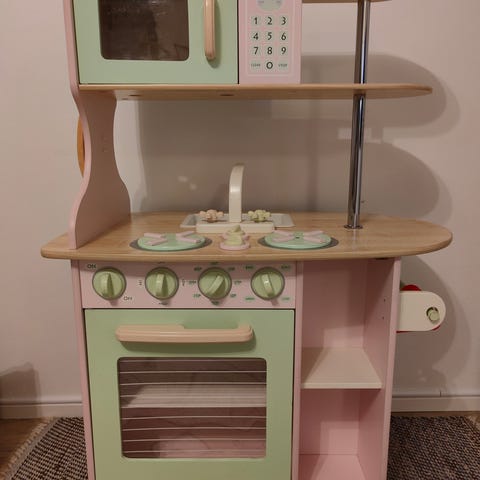 Monipuolinen leikkikeittiö, jossa myös paljon säilytystilaa. Keittiössä lavuaari, hana, mikro, uuni, astianpesukone ja jääkaappi.