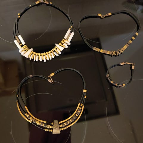 Rannekorun halkaisija noin 6 cm ja leveys 2,2 cm. Kaulakorun halkaisija noion 3 cm. Kaulakorussa rengas ketjua varten (ketju ei ole mukana).