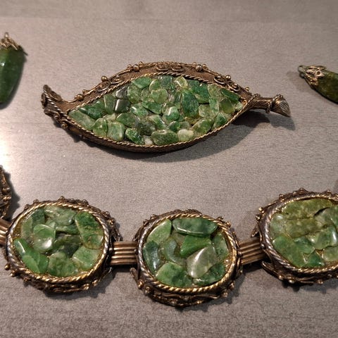 Vanha vintage rannekoru, ilmeisesti hopeaa/hopeoitu tai hopeanvärinen metalliseos ja samaan sarjaan kuuluva kaulakoru.