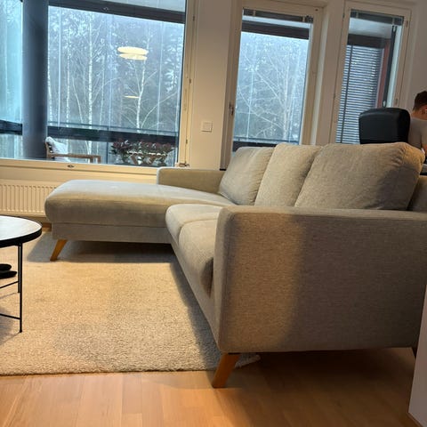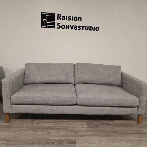 Myynnissä Karlstad 3:n istuttava sohva ja samaa sarjaa oleva rahi. Karlstad sohva on hyvin selkälinjainen. Sohvan runko on kunnon puuta ja vaneria. Ei siis lastulevyä. Sohvan runko ja jouset ovat ehjät. Sohvan ja rahin kaikki kankaat ovat irroitettavissa pesuun. Rungonpäälliset mukaan lukien. Lisäksi sohvan istuin ja selkätyynyjen kankaat ovat ympäriverhoillut. Tyynyt siis käännettävissä. Tämä luonnollisesti tuplaa kankaat, että itse tyynyjen käyttöiän. Korkeat jalat mahdollistavat helpon puhtaanapidon sohvan ja rahin alta. Huomioitavaa päällisten kunnossa: Rahin päällisessä "isohko" haalea tahra. Näkyy kirkkaassa valossa. Lisäksi sohvan istuintyynyjen päällisissä muutama haalea tahra. Kyseiset tahrat huomioitu hinnassa rankalla kädellä. Ryhmän hinta: 269e.