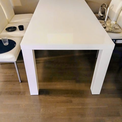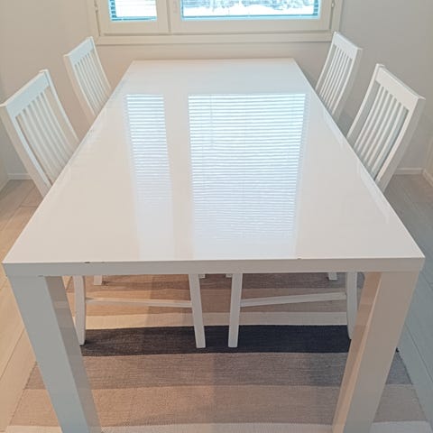 Ruokapöytä, 6 hlö, valk. korkeakiilto