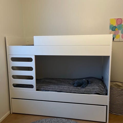 Myydään tarpeettomana AVA ROOM täyspitkä kerrossänky. Mukaan tulee 2 sänkyä (laminoitu valkoinen koivuvaneri), yläsängyn turvalaita, tikapuut, vuode- /säilytyslaatikko, patjat, sekä vetoketjulliset päiväpeitot (vaalean harmaa). Normaalia käytön jälkiä on, mutta kokonaisuus on siistissä ja ehjässä kunnossa. Meillä ei ole lemmikkejä.