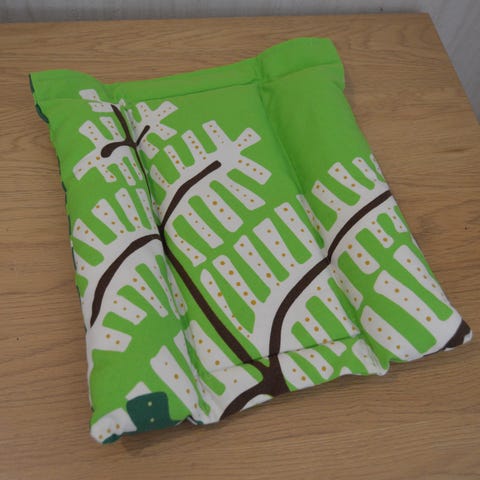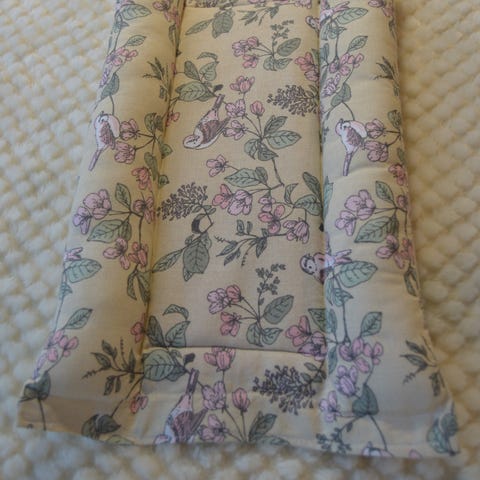 Pituus 37cm, leveys reunojen kanssa 23cm, patjaosa 11cm. Kangas on 100% puuvillaa. Täytteenä reunoilla täytevanua, pehmusteena keskellä levyvanua. Koon puolesta sopii etenkin kääpiökaneille 2kg asti, myös pienemmille kissoille ja marsuille.