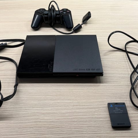 PS2 pelikonsoli ja kaapelit
