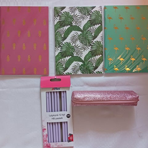 KUVASSA 1 kaikki myytävät tavarat / koulutarvikkeet.