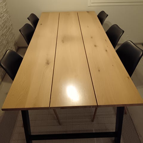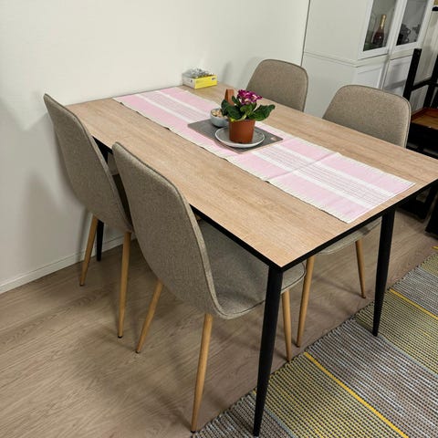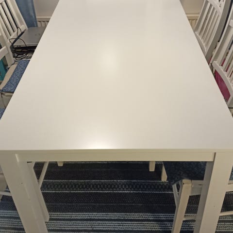 On ollut vuosia lapsiperheen käytössä joten käytön jälkiä on ja keskeltä hieman notkollaan ku pitkäpöytä on.