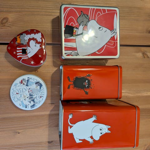 2 kpl Muumi peltirasioita mm. kahvinsäilytykseen. Muumipeikossa pieni painauma, joka ei erotu valokuvassa.
