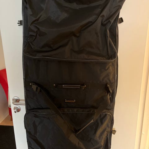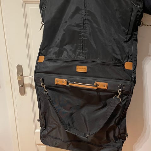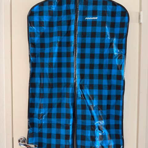 Tummansininen Finnairin pukupussi logolla. Leveys 58 cm, pituus suljettuna 48 cm ja avattuna 95 cm. Täysin ehjä, toimiva lukko, ripustuskoukku. Kaksi pienempää ja yksi isompi vetoketjutasku. Olkahihna, kantokahva. Toridiili tai noutokin käy.