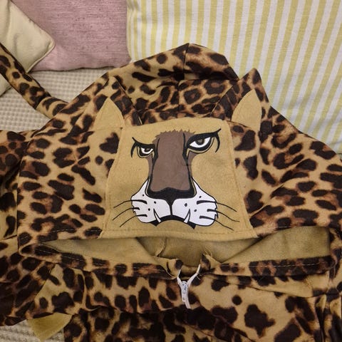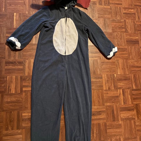 tekoturkiksesta valmistettu nallepuku, iso tasku edessä