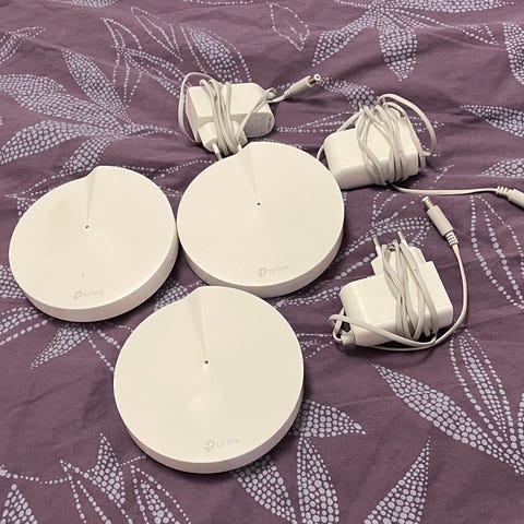 TP-Link Deco reititin, valkoinen väri, pyöreä muotoilu. Laite on tarkoitettu langattomaan verkon laajentamiseen ja parantamiseen kotikäytössä. Toimivat, vaativat putsaamista. 25€/kpl voi ostaa myös yksitellen. 6kpl 125€!