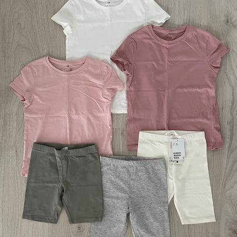 H&M t-paidat koko 122/128 ja leggingsit koko 122. Paidoissa pienet haaleat pistetahrat/tahraa, samoin leggingsien polvessa.