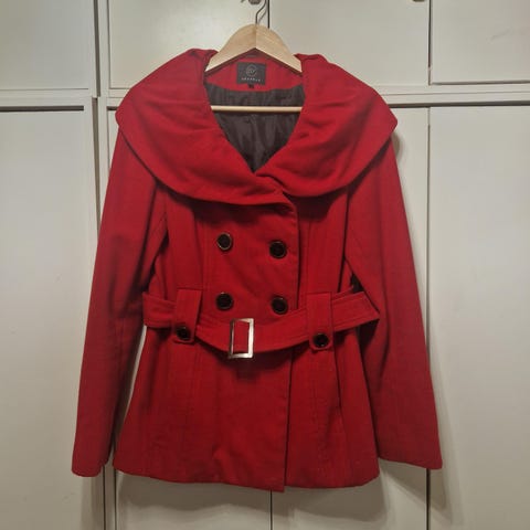 Tyylikäs musta villakangastakki, jossa kaunis suuri kaulus ja vyö korostamassa vyötäröä. Ajaton ja elegantti malli, sopii hyvin sekä arkeen että siistimpään käyttöön. Lämmin ja ryhdikäs takki talvikauteen.