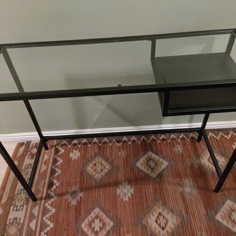 Lasinen työpöytä, jossa kromatut reunat. Pöytä tarjoaa modernin ja läpinäkyvän työskentelytilan. Sopii erinomaisesti toimistokäyttöön tai kotiympäristöön, jossa arvostetaan minimalistista ja selkeää muotoilua.