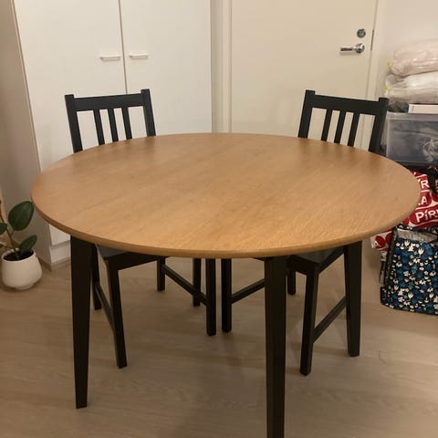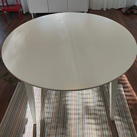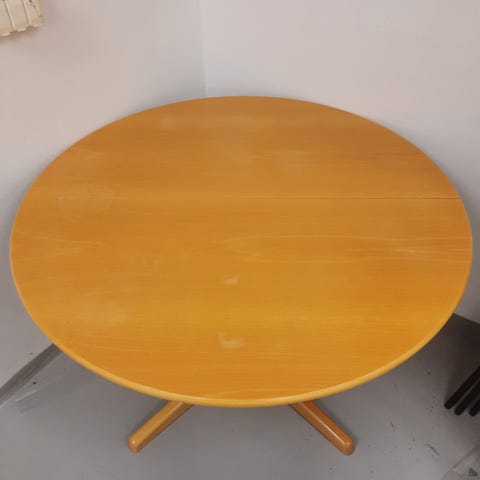 Pyöreä ruokapöytä. Pöydän kansilevy täyspuuta, joka maalattu valkoiseksi. Maalipinta kulunut. Pöydän jalka trumpetin mallinen, hopea, metallia. On nyt kahdessa osassa varastossa. Pöytälevy helppo vaihtaa toiseen. Nouto Hämeenlinnan keskustasta, tai kuljetus lisämaksua vastaan lähialueelle. Tukeva. Maksu käteisellä, tai mobilepay.