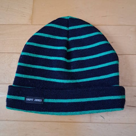 Myydään Saint James -villahuivi. Raidallinen huivi tummansinisellä pohjalla ja vihreillä raidoilla. Laadukas neulos, valmistettu Ranskassa.