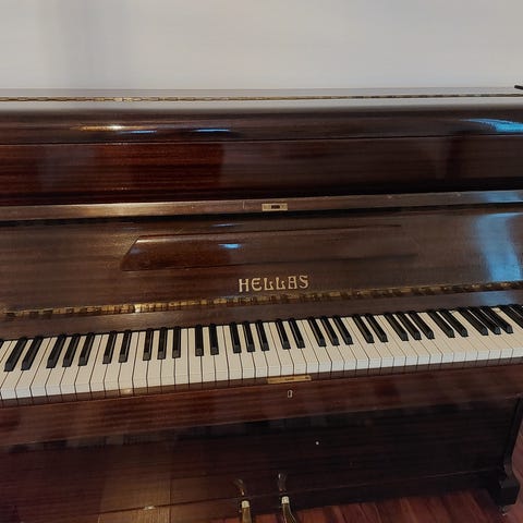 Hsinghai piano ruskealla viimeistelyllä. Piano soveltuu soittoon ja harjoitteluun. Mukaan myös istuinpenkki.