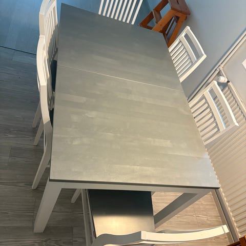 Kotimainen Pohjanmaan ruokailuryhmä. Jatkettava pöytä ja 6 tuolia. Tuoleissa tekstiiliverhoilu. Muutamia tahroja, pesu jää ostajalle.