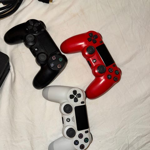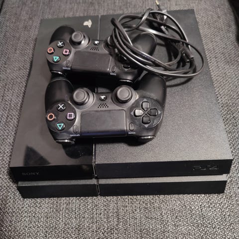 Playstation 4 pelikonsoli kahdella toimivalla ohjaimella.